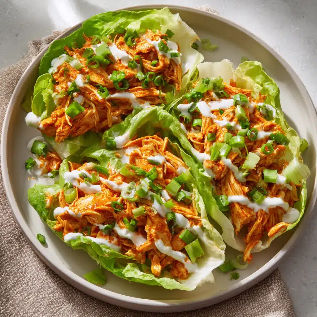 These crisp and spicy Buffalo Chicken Lettuce Wraps feature tender shredded chicken coated in a thick, vibrant buffalo sauce, nestled in fresh butter lettuce cups, and topped with a creamy ranch drizzle.