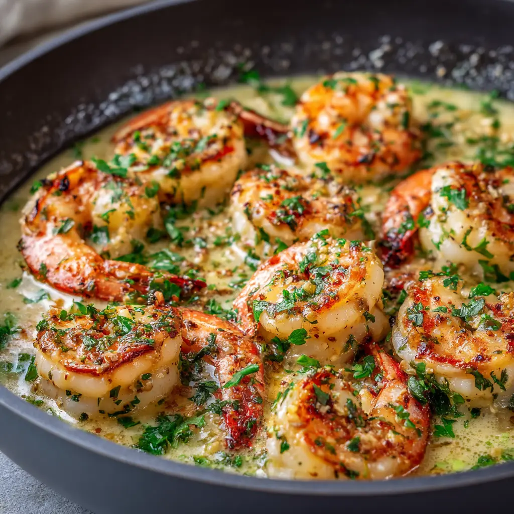 A stunning overhead shot of creamy coconut garlic shrimp in a skillet, garnished with fresh herbs. This easy shrimp recipe is perfect for a quick dinner.