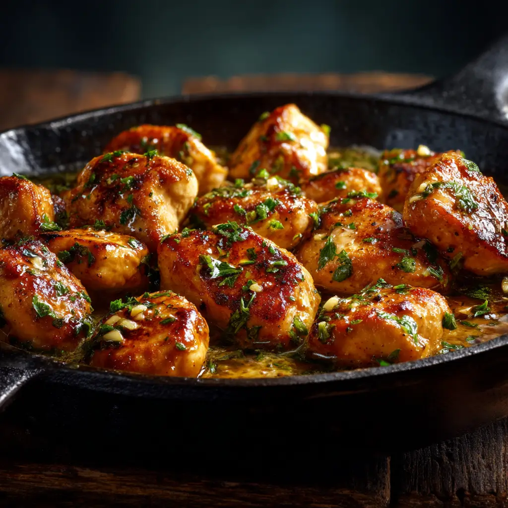 A skillet filled with juicy Cowboy Butter Chicken Bites, garnished with fresh parsley. The chicken pieces are golden brown and coated in a rich, delicious butter sauce.