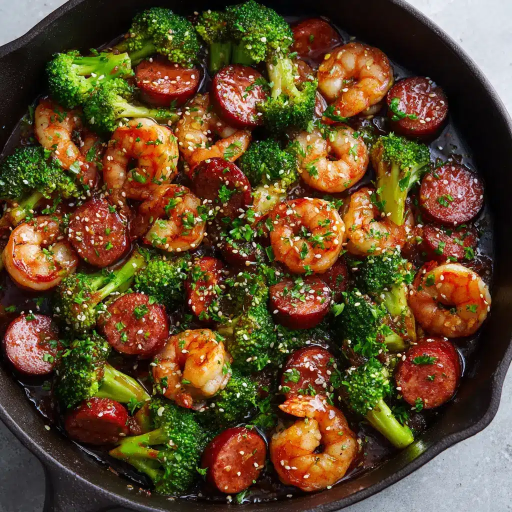 Every bite delivers plump pink cooked shrimp, thick diagonally sliced browned smoked sausage, and vibrant green tender-crisp broccoli florets. Everything is generously coated in a glossy, thick, dark amber sticky honey garlic sauce that clings to every ingredient. Scattered on top are tiny white toasted sesame seeds and finely chopped fresh green parsley flakes, elevating the dish from a simple meal to a culinary experience.