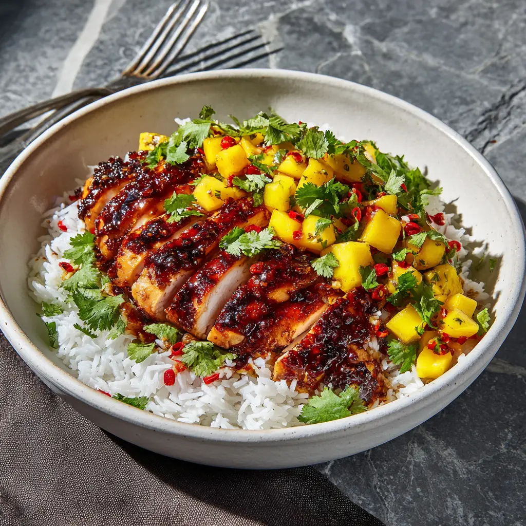 A beautiful plate of honey-soy glazed chicken served with a colorful mango salsa and a side of fluffy white rice.