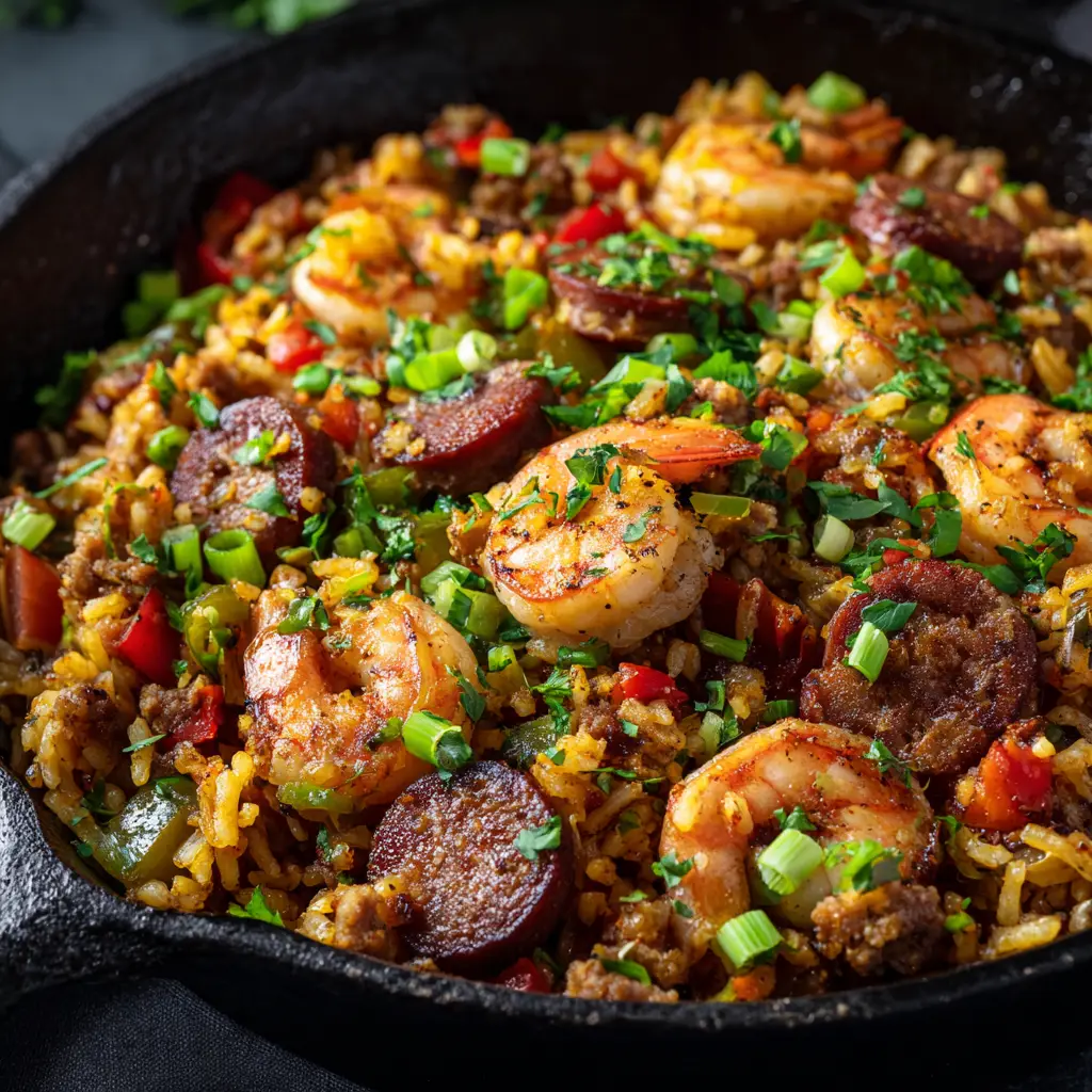 Uncover the skillet and gently fluff the rice with a fork. Add the peeled and deveined shrimp and the cooked sausage back into the pot. Stir to combine, then cover the skillet again and let it cook for another 5-7 minutes, or until the shrimp are pink, opaque, and cooked through. Garnish with chopped green onions and fresh parsley before serving.